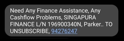 Scammers use unsolicited messages sent via the messaging platform to members of the public purportedly from Singapura Finance offering loans or finance assistance. Singapura Finance will not send you any unsolicited emails or SMSes of such nature without obtaining your prior consent. If you receive any such messages, kindly disregard them.